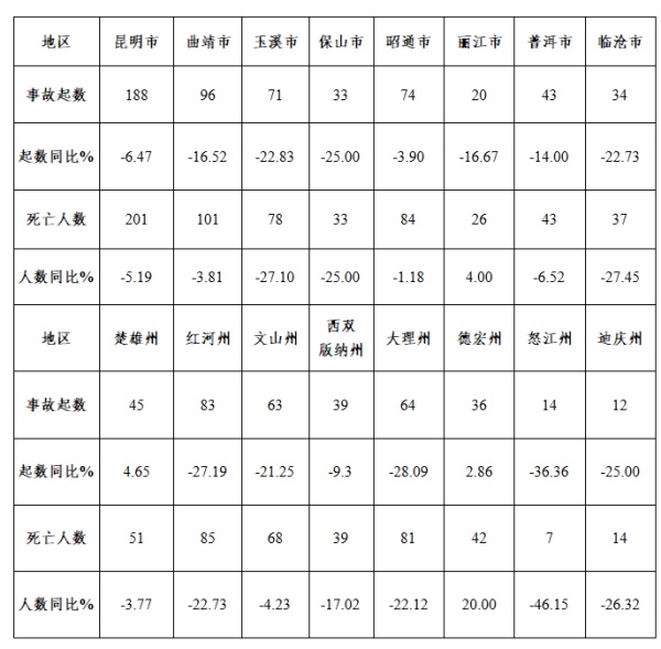 較大事故:曲靖市3起、死亡13人,事故起數(shù)同比持平、死亡人數(shù)減少1人;大理州3起、死亡11人,同比減少1起、2人;昆明市2起、死亡7人,同比增加2起、7人;楚雄州2起、死亡6人,事故起數(shù)同比持平、死亡人數(shù)同比減少1人;紅河州2起、死亡7人,事故起數(shù)和死亡人數(shù)同比持平;德宏州2起、死亡8人,同比增加2起、8人;省直管區(qū)2起、8人,同比增加2起、8人;玉溪市1起、死亡3人,同比減少1起、6人;昭通市1起、死亡6人,事故起數(shù)同比持平、死亡人數(shù)增加2人;麗江市1起、死亡3人,同比增加1起、3人;文山州1起、死亡3人,同比減少1起、3人。