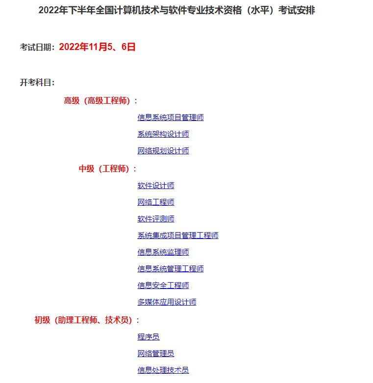 2、中級資格:軟件設(shè)計師、網(wǎng)絡(luò)工程師、軟件評測師、系統(tǒng)集成項目管理工程師、信息系統(tǒng)監(jiān)理師、信息系統(tǒng)管理工程師、信息安全工程師、多媒體應(yīng)用設(shè)計師;