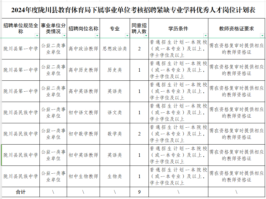 根據(jù)《關(guān)于同意縣教育體育局黨組使用編制通知單》(隴機(jī)編辦準(zhǔn)[2023]4號(hào))及《隴川縣人力資源和社會(huì)保障局關(guān)于印發(fā)2024年教育衛(wèi)生部門(mén)考核招聘緊缺專(zhuān)業(yè)學(xué)科優(yōu)秀人才工作方案的通知》隴人社發(fā)〔2024〕2號(hào)文件精神,2024年隴川縣教體系統(tǒng)考核招聘緊缺專(zhuān)業(yè)學(xué)科優(yōu)秀人才9名,其中:隴川縣第一中學(xué)4名、隴川縣民族中學(xué)5名,F(xiàn)將有關(guān)事宜公告如下:
