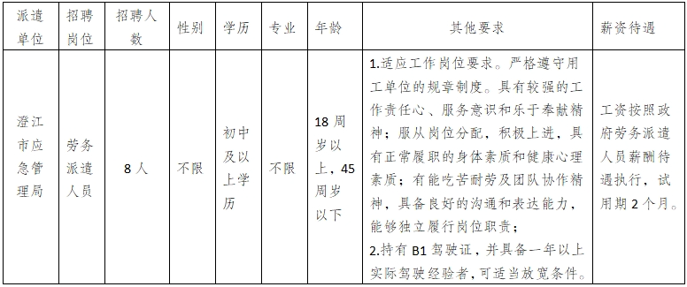 澄江市應(yīng)急管理局因工作需要,委托澄江市啟澄人力資源有限責(zé)任公司面向社會(huì)公開招聘政府專職消防員8名,招聘相關(guān)事項(xiàng)如下: