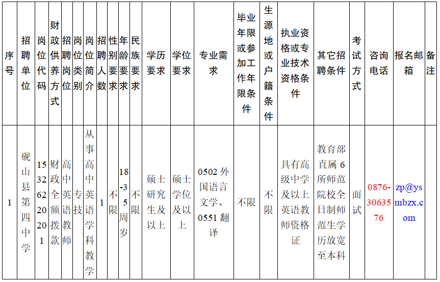 因2024年硯山縣第四中學(xué)緊缺招聘高中英語(yǔ)教師空崗,根據(jù)《事業(yè)單位人事管理?xiàng)l例》(中華人民共和國(guó)國(guó)務(wù)院令652號(hào))《事業(yè)單位公開(kāi)招聘人員暫行規(guī)定》(中華人民共和國(guó)人事部令第6號(hào))《云南省事業(yè)單位公開(kāi)招聘工作人員辦法》(云人社發(fā)〔2016〕182號(hào))《2024年文山州事業(yè)單位緊缺崗位招聘通告》的規(guī)定,經(jīng)州人力資源和社會(huì)保障局批準(zhǔn),現(xiàn)將硯山縣2024年硯山縣第四中學(xué)高中英語(yǔ)教師崗位第二輪招聘有關(guān)事項(xiàng)通告如下。
