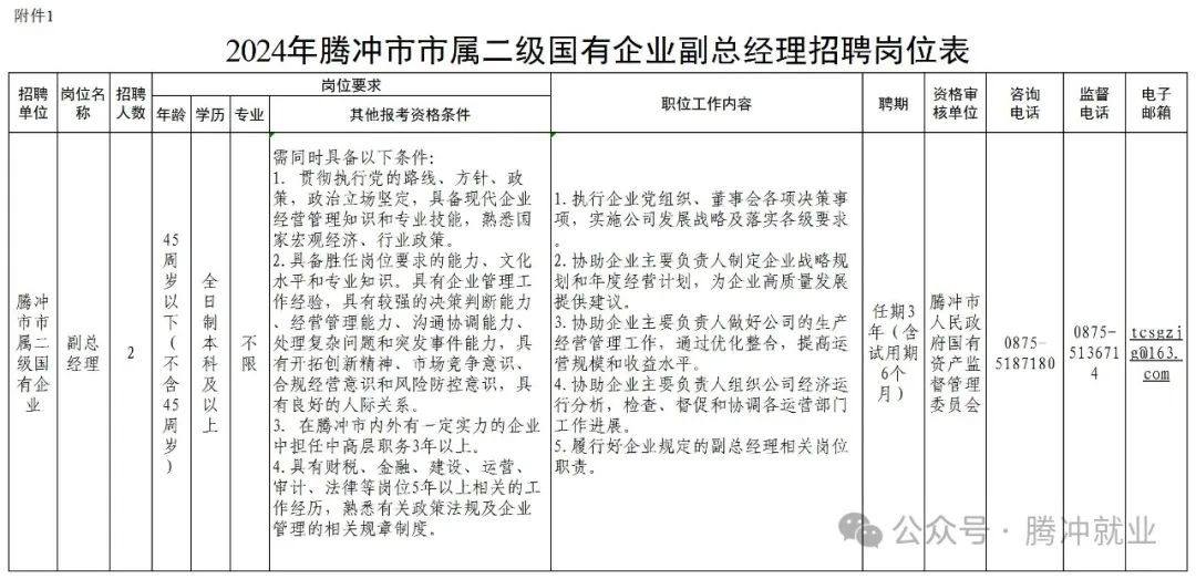 附件:1. 2024年騰沖市市屬二級(jí)國(guó)有企業(yè)副總經(jīng)理招聘崗位表