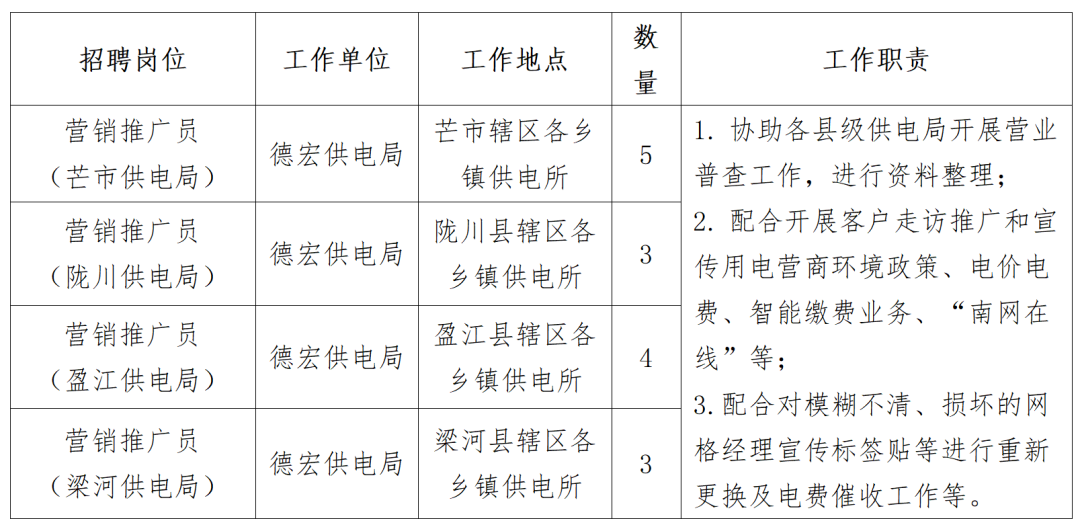 為滿足季節(jié)性、短期性項目工作需要,南方電網(wǎng)云南德宏供電局現(xiàn)面向社會公開招聘短期項目制用工15人,F(xiàn)將有關(guān)事項公告如下: